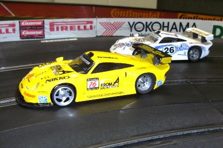 Es wird jeweils mindestens1 Rennen mit gestellten 1:32 Autos gefahren. Wir haben dafür 4 Fly-GT1-Porsche mit Schöler-Chassis vorbereitet.